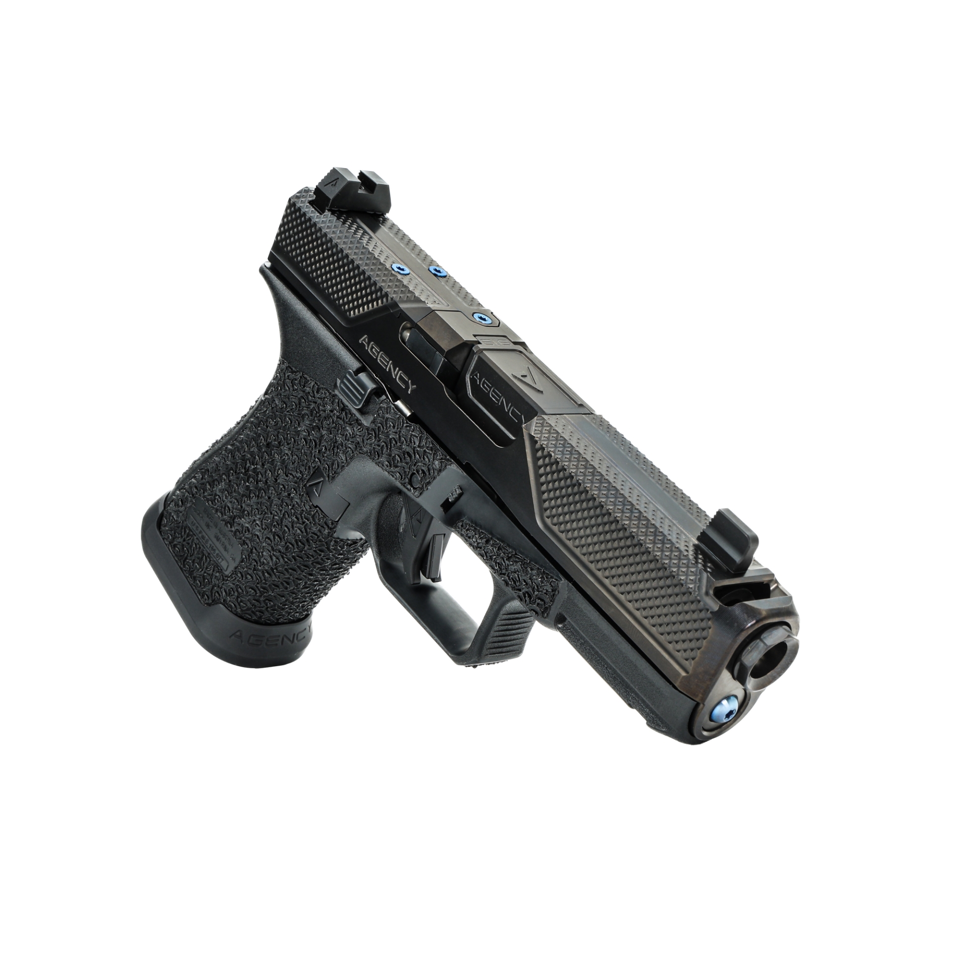 Fully customized Glock 19 Gen 5 direct from Agency Arms, complete with Executive slide cut, new Mono Port, and new LUX stippling pattern