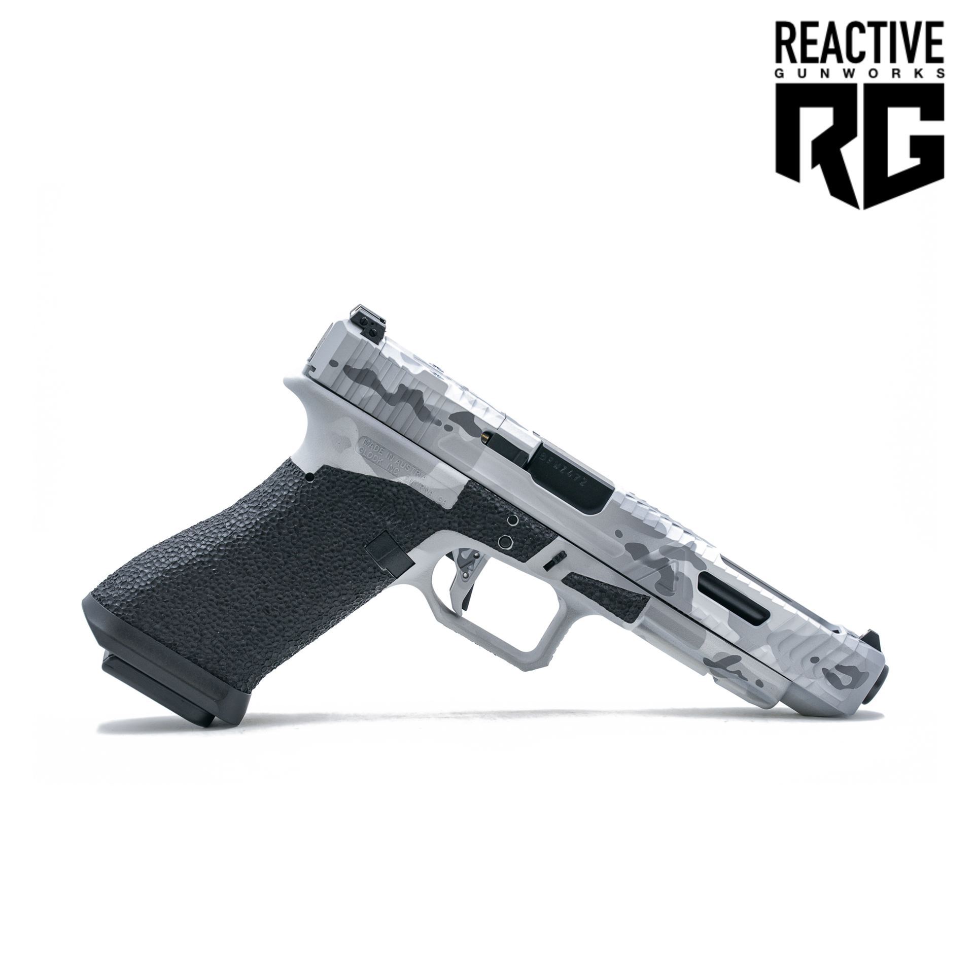 We remove the finger grooves, cut in gas pedals, and bevel out the inside area of the trigger guard on a mill. We call the gas pedals the “Accelerator Cuts” and they offer enhanced traction on the pistol. With the accelerator cuts, muzzle rise is dramatically decreased and follow up shots are faster. We do a non-traditional double undercut and dock the front of the trigger guard for aesthetic purposes. We finish the frame off with full stippling and offer Gen 4 back strap melding as well for no additional charge.