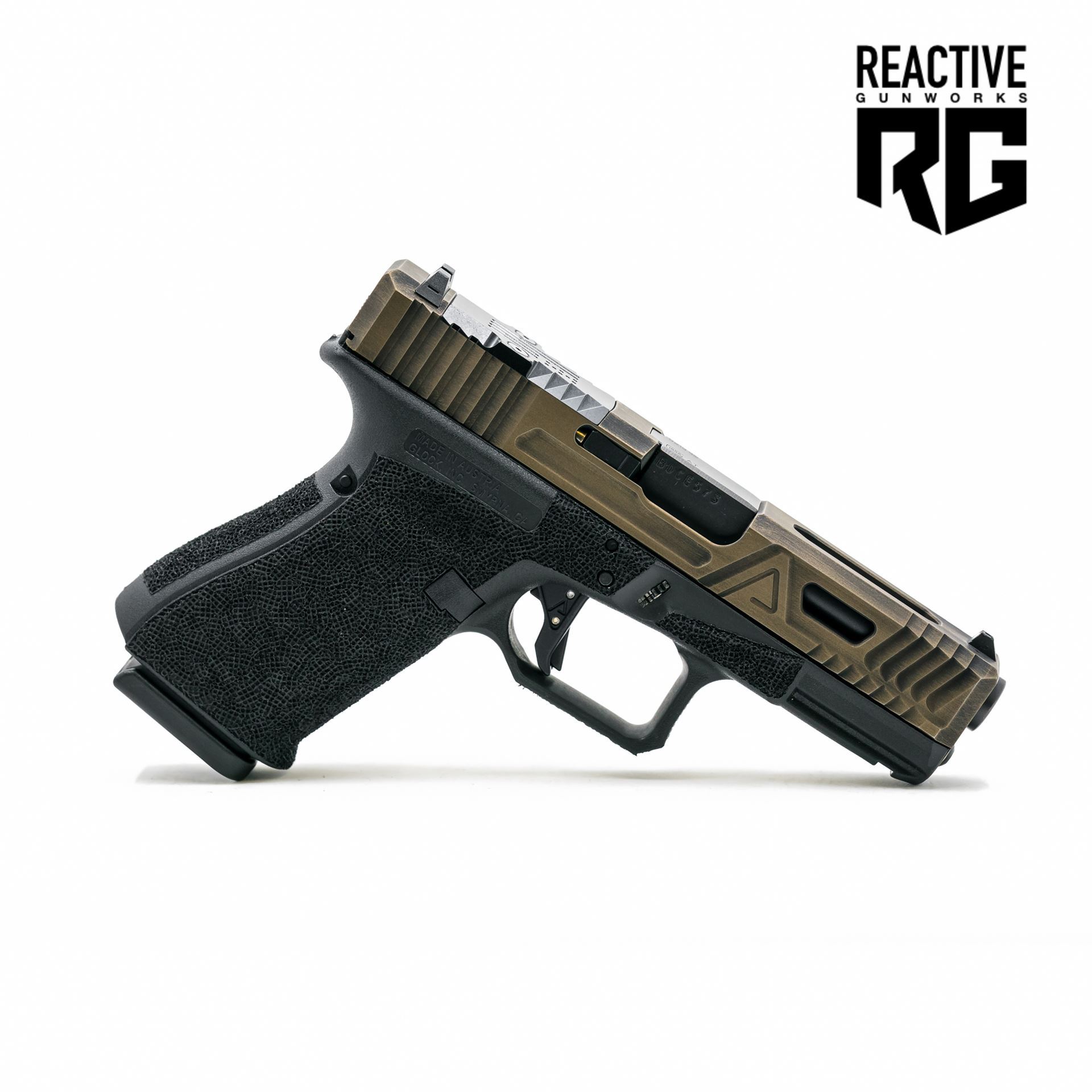 We remove the finger grooves, cut in gas pedals, and bevel out the inside area of the trigger guard on a mill. We call the gas pedals the “Accelerator Cuts” and they offer enhanced traction on the pistol. With the accelerator cuts, muzzle rise is dramatically decreased and follow up shots are faster. We do a non-traditional double undercut and dock the front of the trigger guard for aesthetic purposes. We finish the frame off with full stippling and offer Gen 4 back strap melding as well for no additional charge.