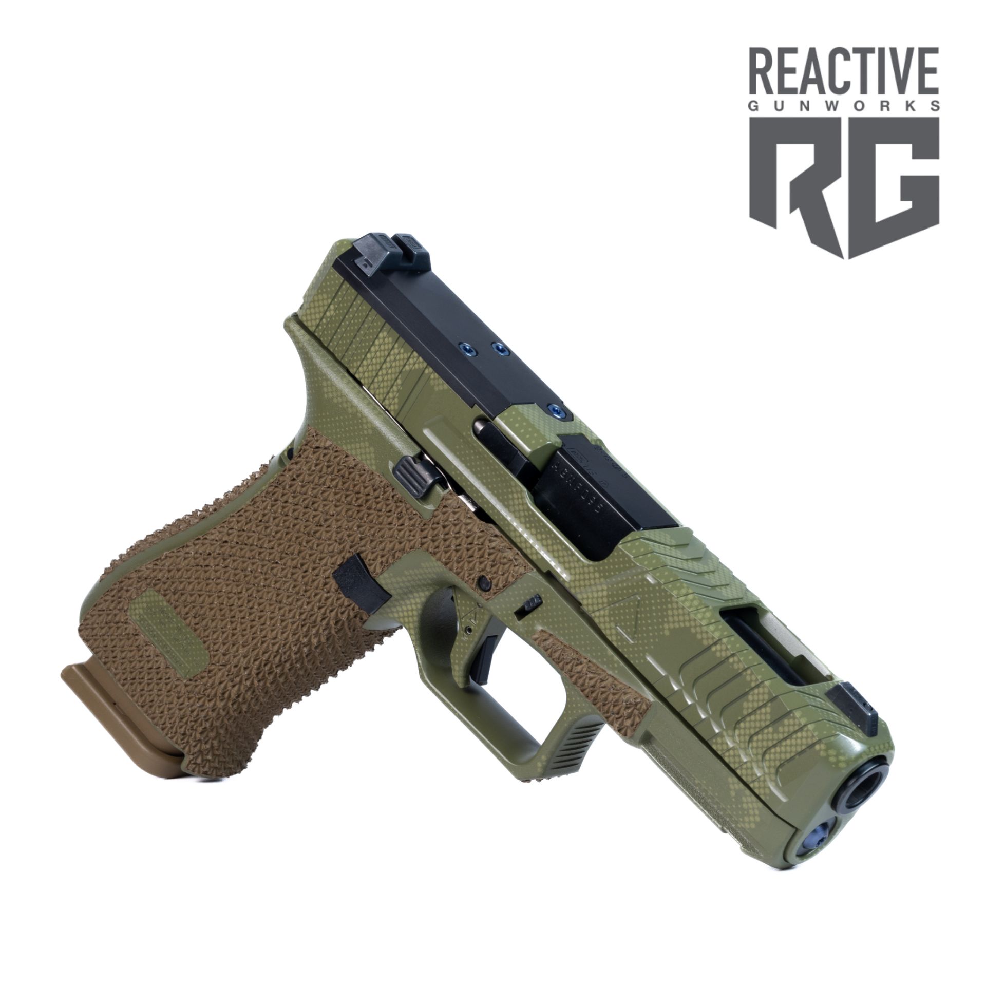 Fully customized Glock 19X direct from Agency Arms, complete with EXA slide cut, Bazooka Green Halftone-lasered Cerakote, Aggressive texture framework, and milled with the Agency Optic System.