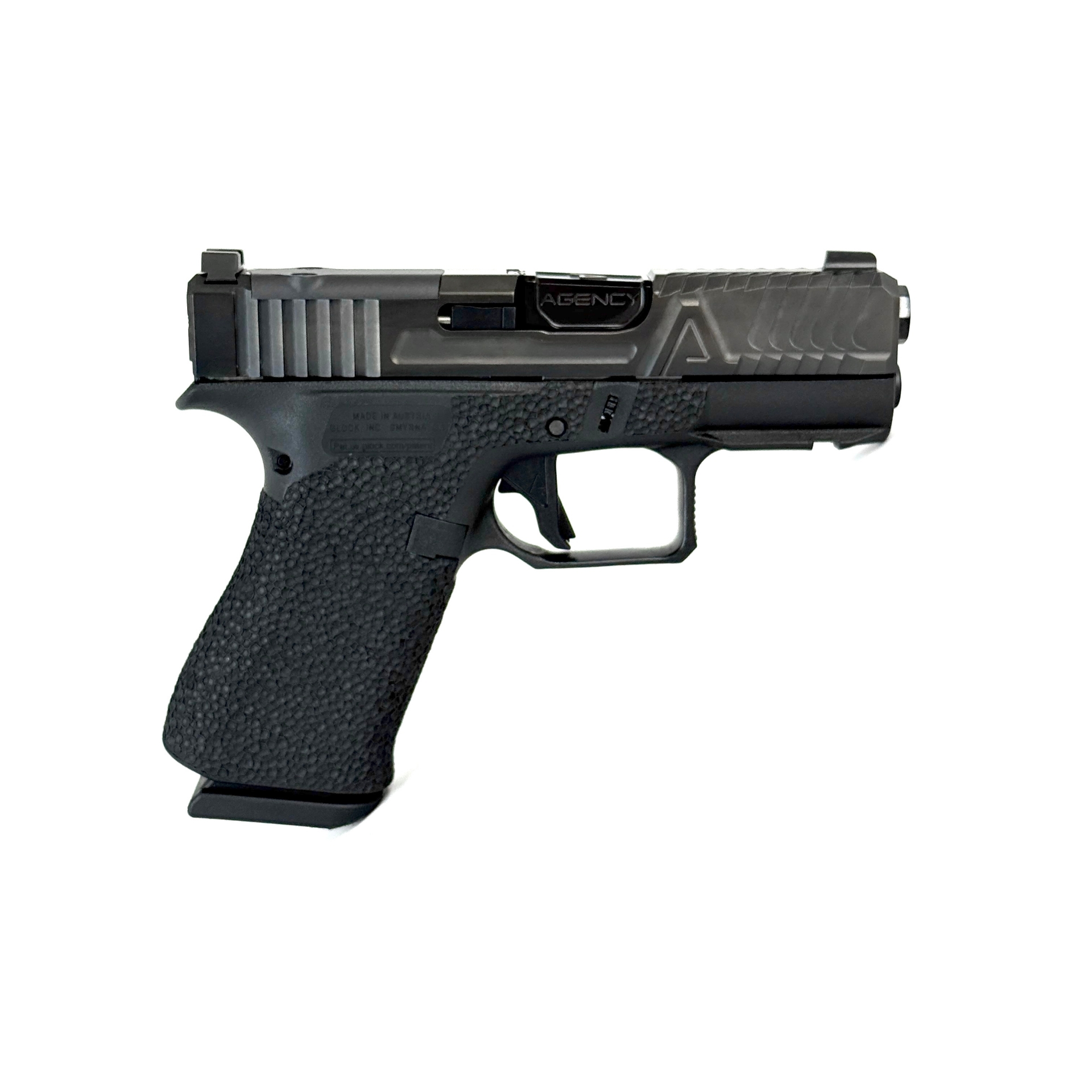 Fully customized Glock 43X MOS direct from Agency Arms, complete with Bonesaw slide cut, Premier Line barrel, Black DLC slide coating, EDC texture framework, and direct milled for 507K/EPS Carry.