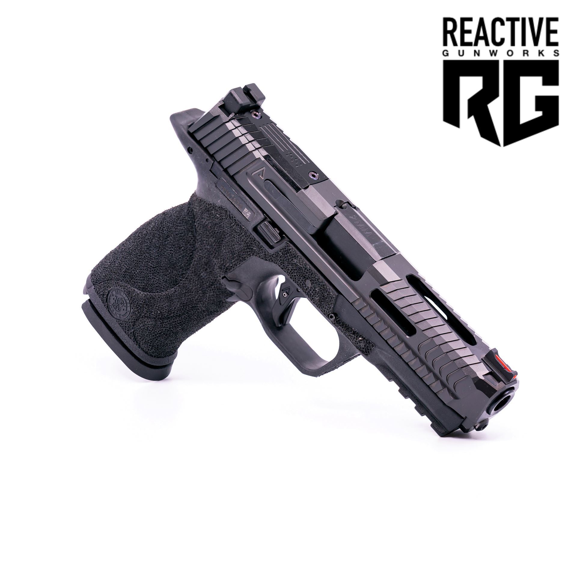 We remove the finger grooves, cut in gas pedals, and bevel out the inside area of the trigger guard on a mill. We call the gas pedals the “Accelerator Cuts” and they offer enhanced traction on the pistol. With the accelerator cuts, muzzle rise is dramatically decreased and follow up shots are faster. We do a non traditional double undercut and dock the front of the trigger guard for aesthetic purposes. We finish the frame off with full stippling